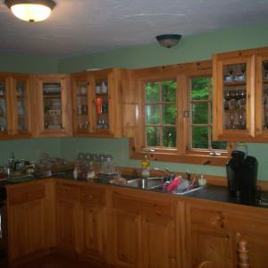 Scrapped, sanded, and caulked entire building. Three different paints used for finish including green semi-gloss requiring three coats.